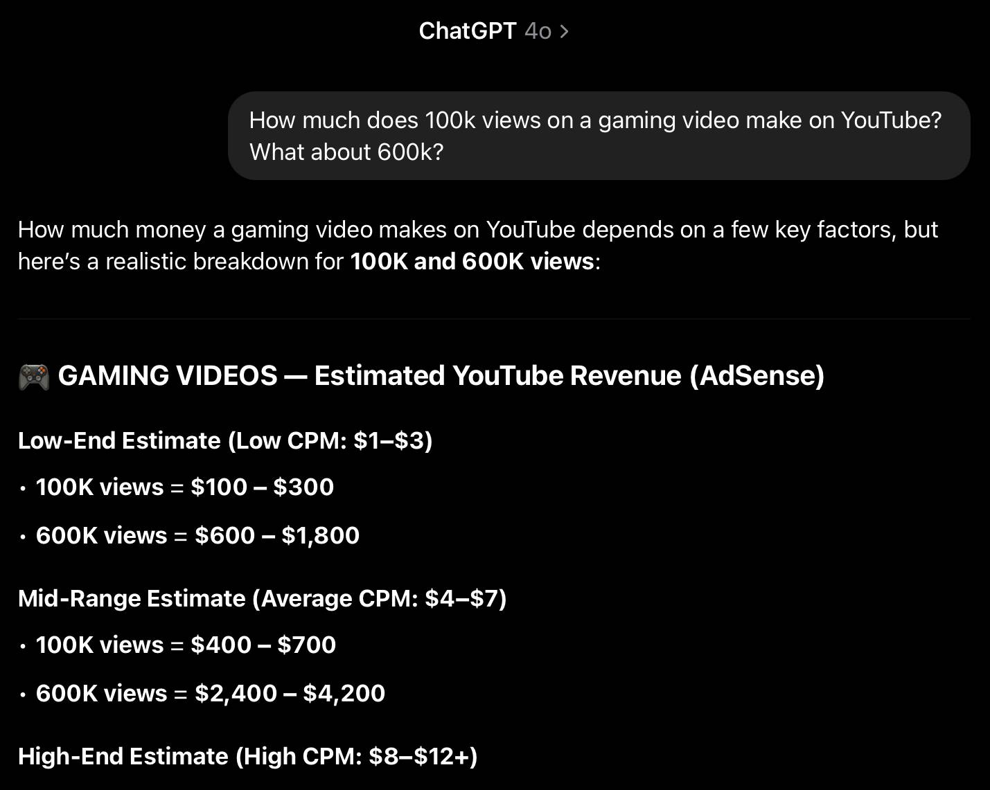 That’s super admirable and I’d love to rival that, doing the same thing—especially when I realized: YouTubers are making $600-$1,000 per video.